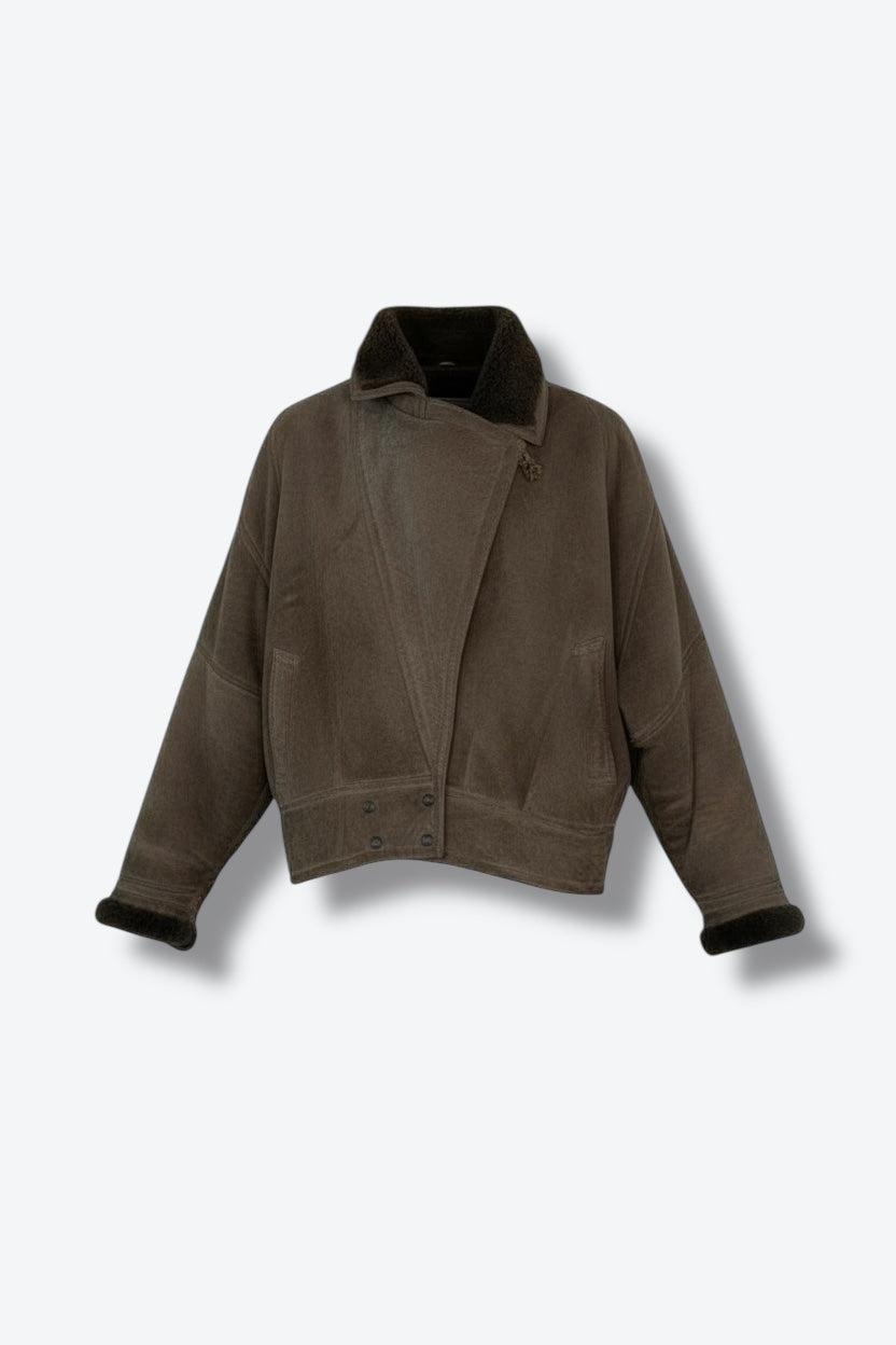 Make a statement in this vintage shearling aviator jacket, a bold outerwear piece from the 1980s. Crafted from soft suede with a plush shearling lining, this jacket delivers both warmth and unmistakable style. Its oversized, boxy fit, asymmetrical front closure, and moto-inspired snap details bring a powerful silhouette that’s equal parts rugged and chic.