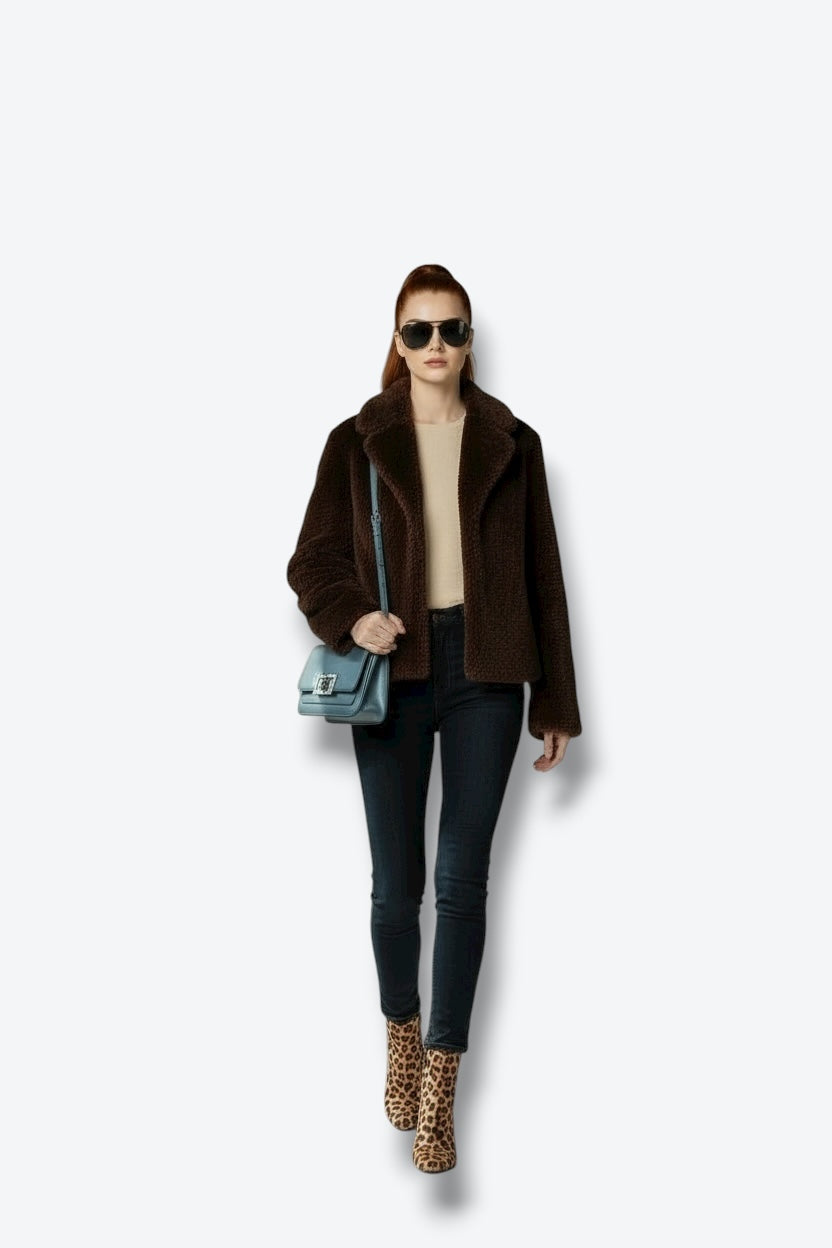 Wrap yourself in effortless sophistication with this vintage teddy jacket in deep chocolate brown. The plush texture brings warmth and polish, while the boxy silhouette channels that easy, off-duty cool. Whether you’re running errands in style or headed to an evening art show, this jacket adds instant depth and texture to your look.
