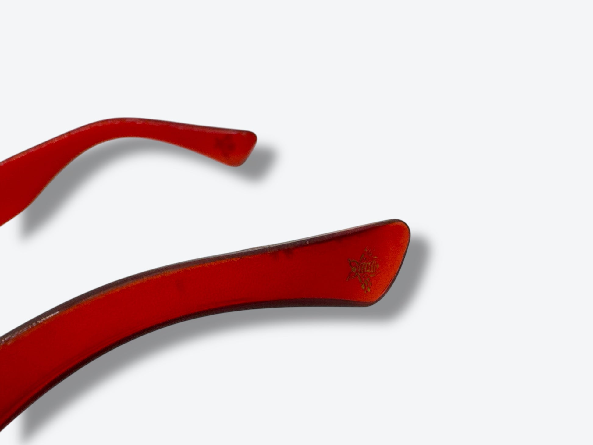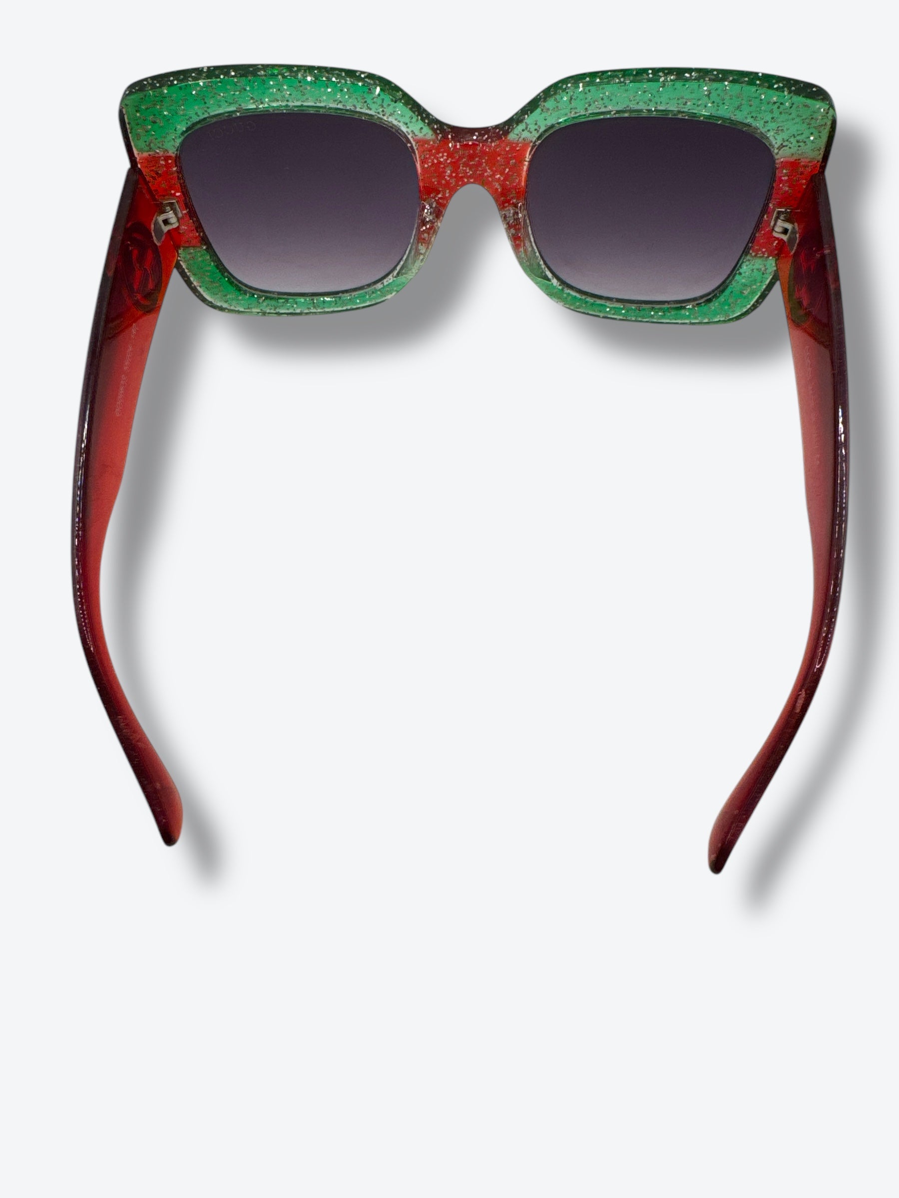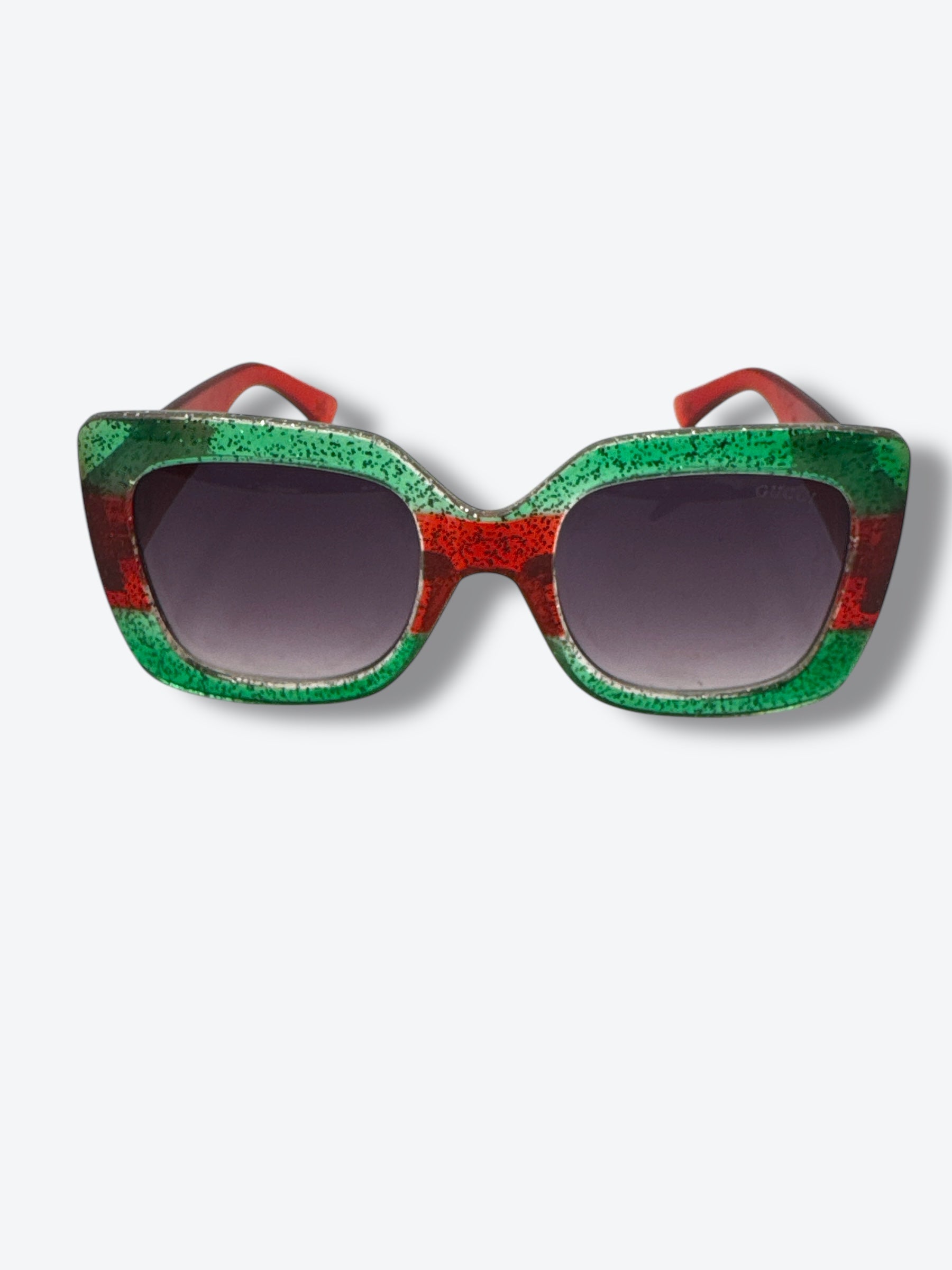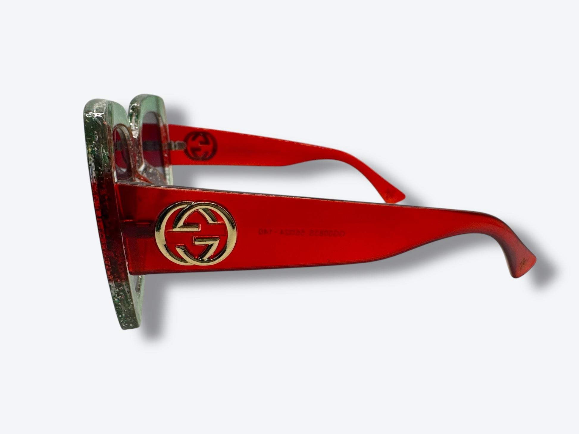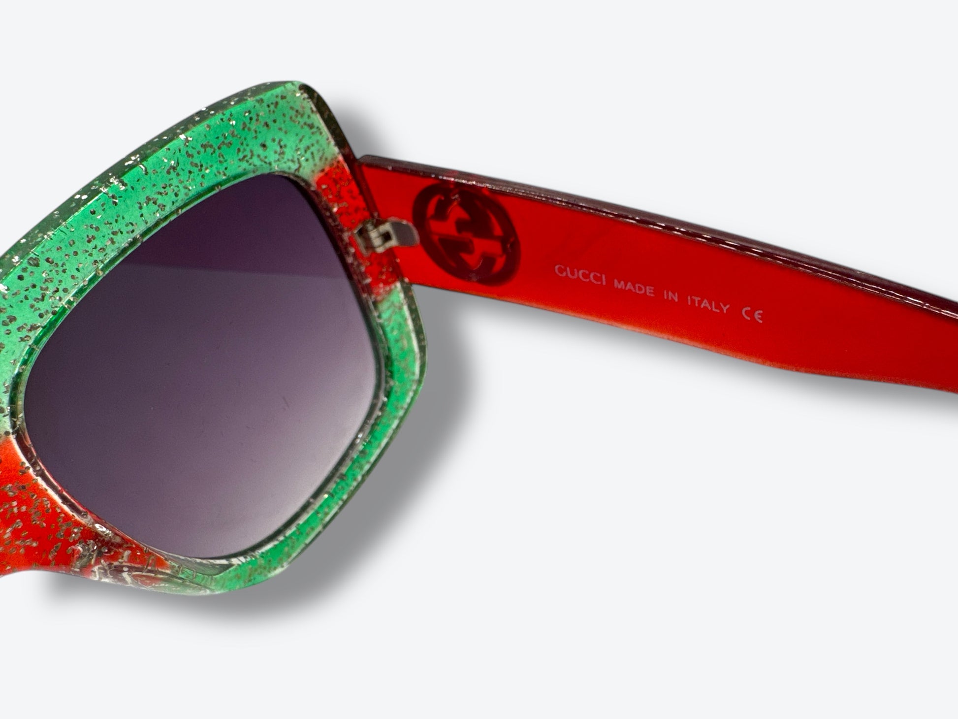 Get ready to rock the Y2K look with our chic and stylish Gucci Sunglasses (GG0083S)! These cool shades feature a playful red and green color combo, with silver glitter throughout for a touch of glam. Perfect for adding a unique twist to any outfit.