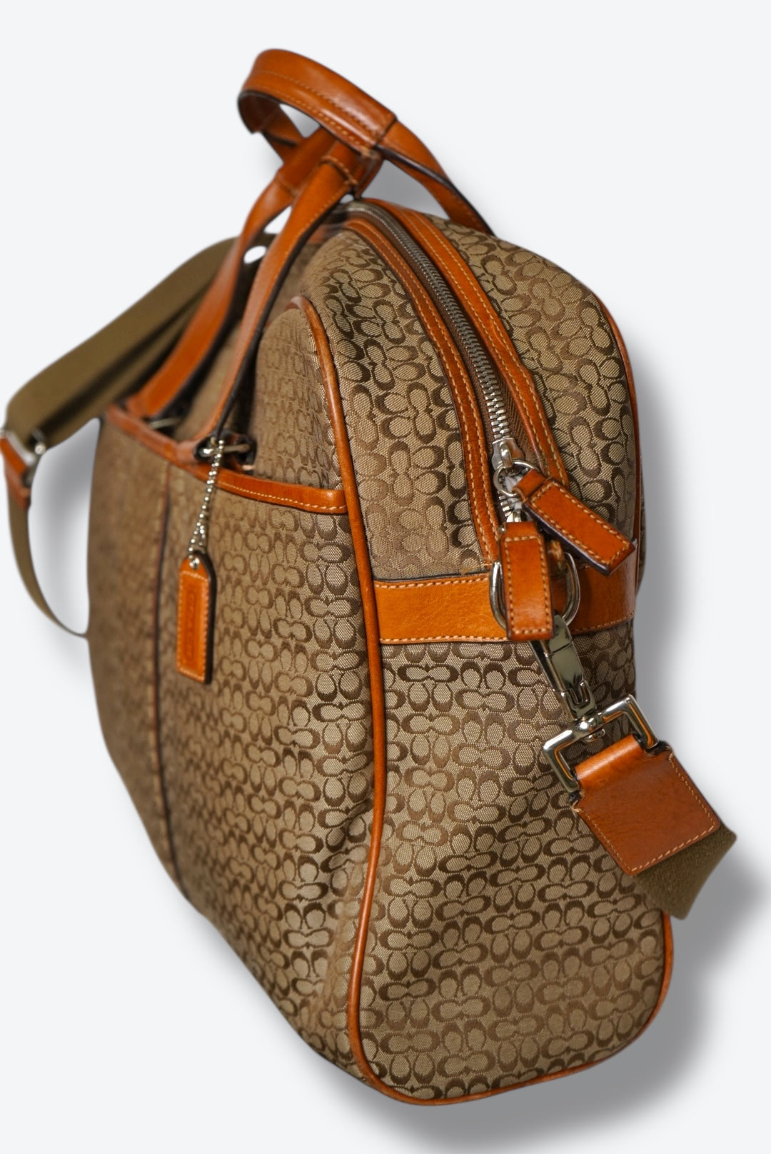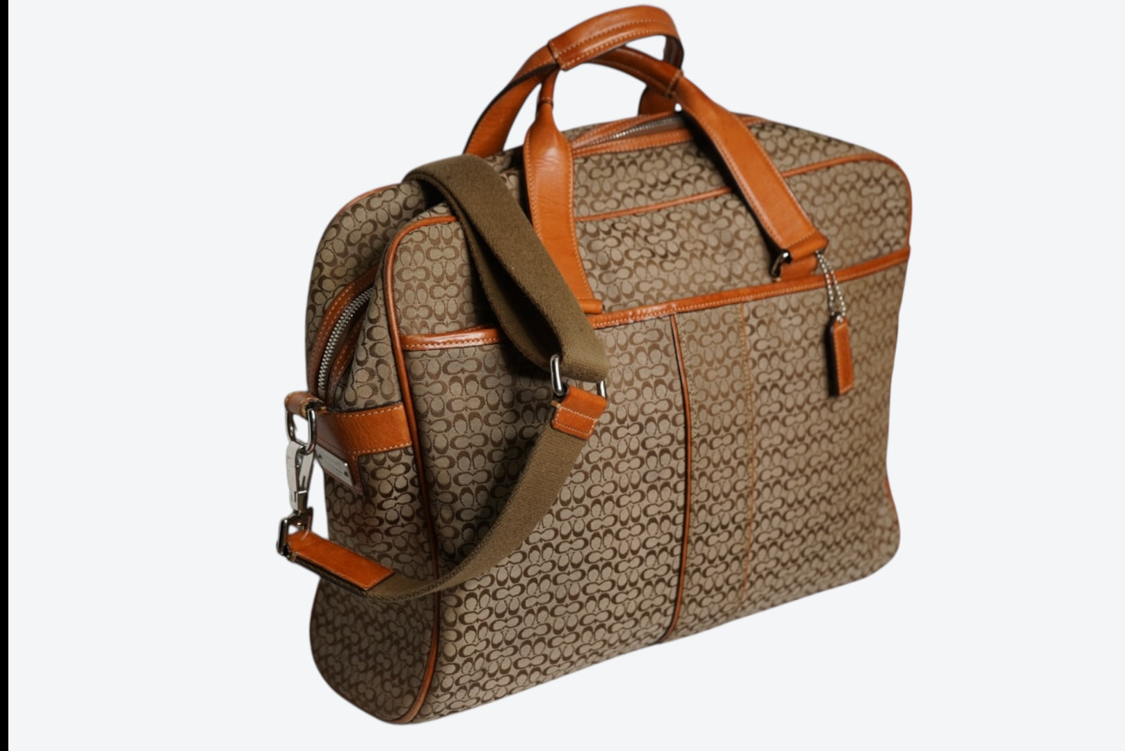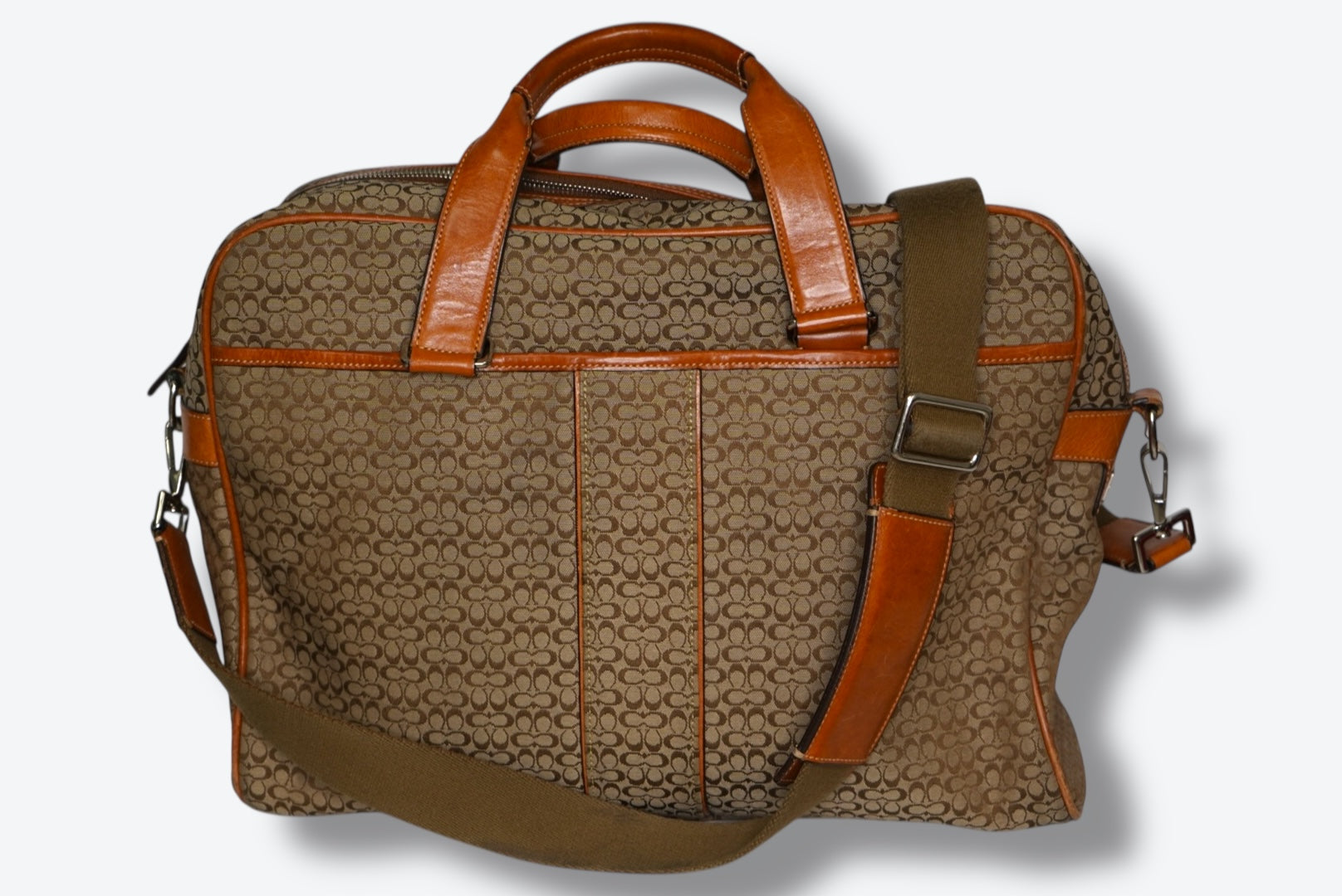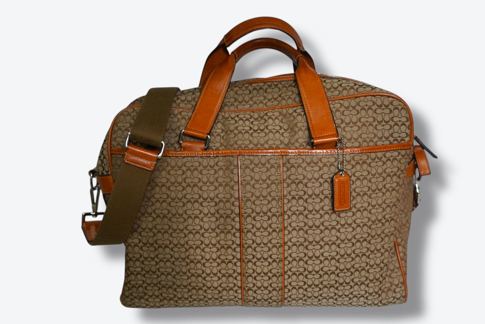 Travel in style with this timeless Coach Signature Messenger Bag. Crafted from Coach’s iconic “C” jacquard canvas and finished with luxurious tan leather trim, this roomy carryall is designed for weekend escapes, quick getaways, or elevated everyday utility. With dual leather top handles, a detachable canvas shoulder strap, and a full-zip closure, it offers both fashion and function in one sleek silhouette.