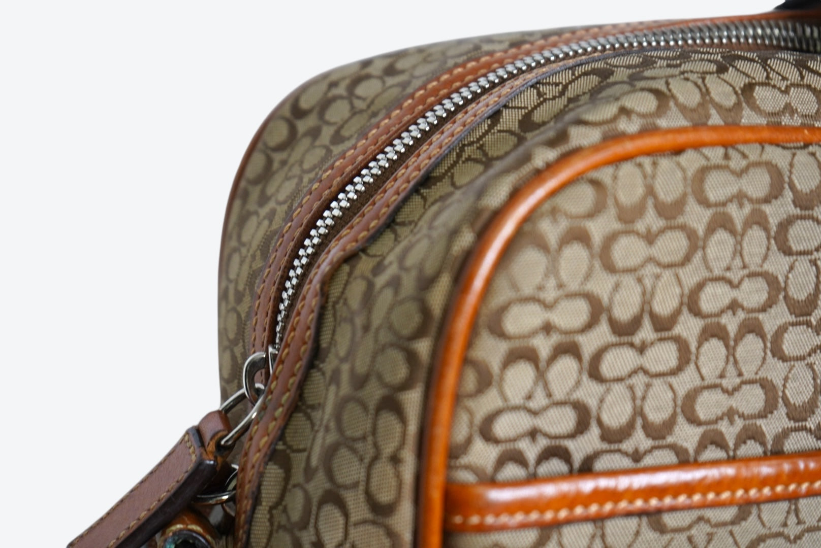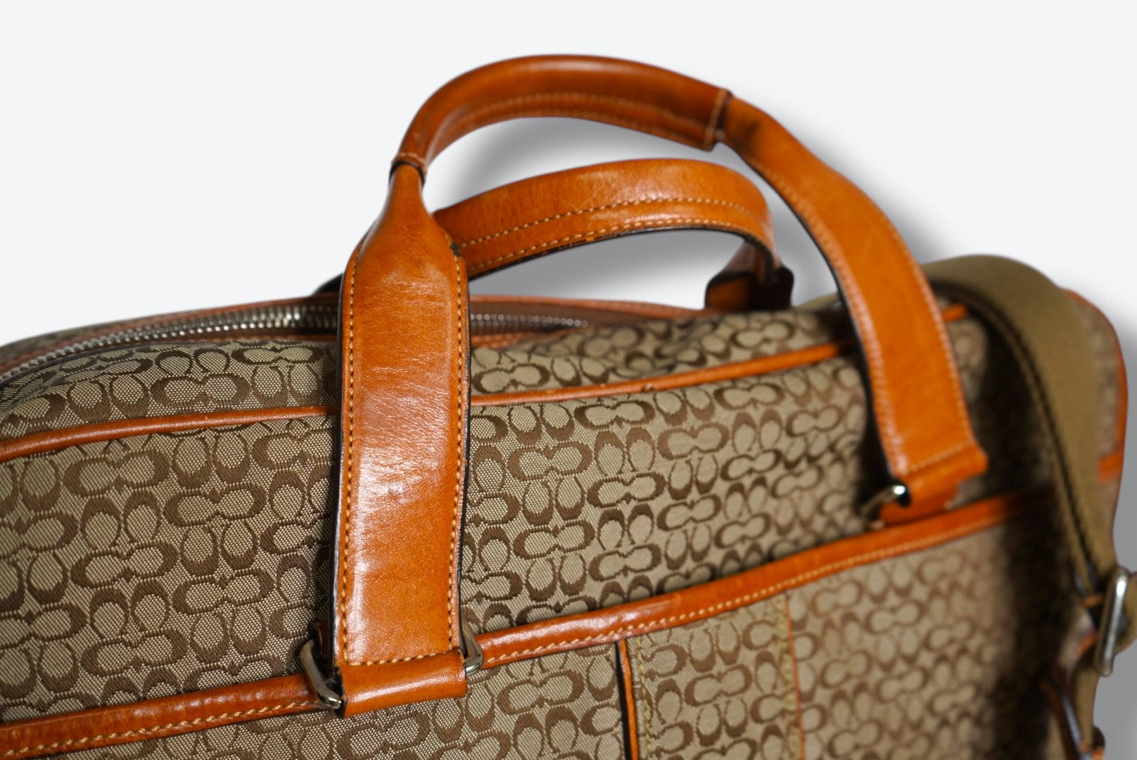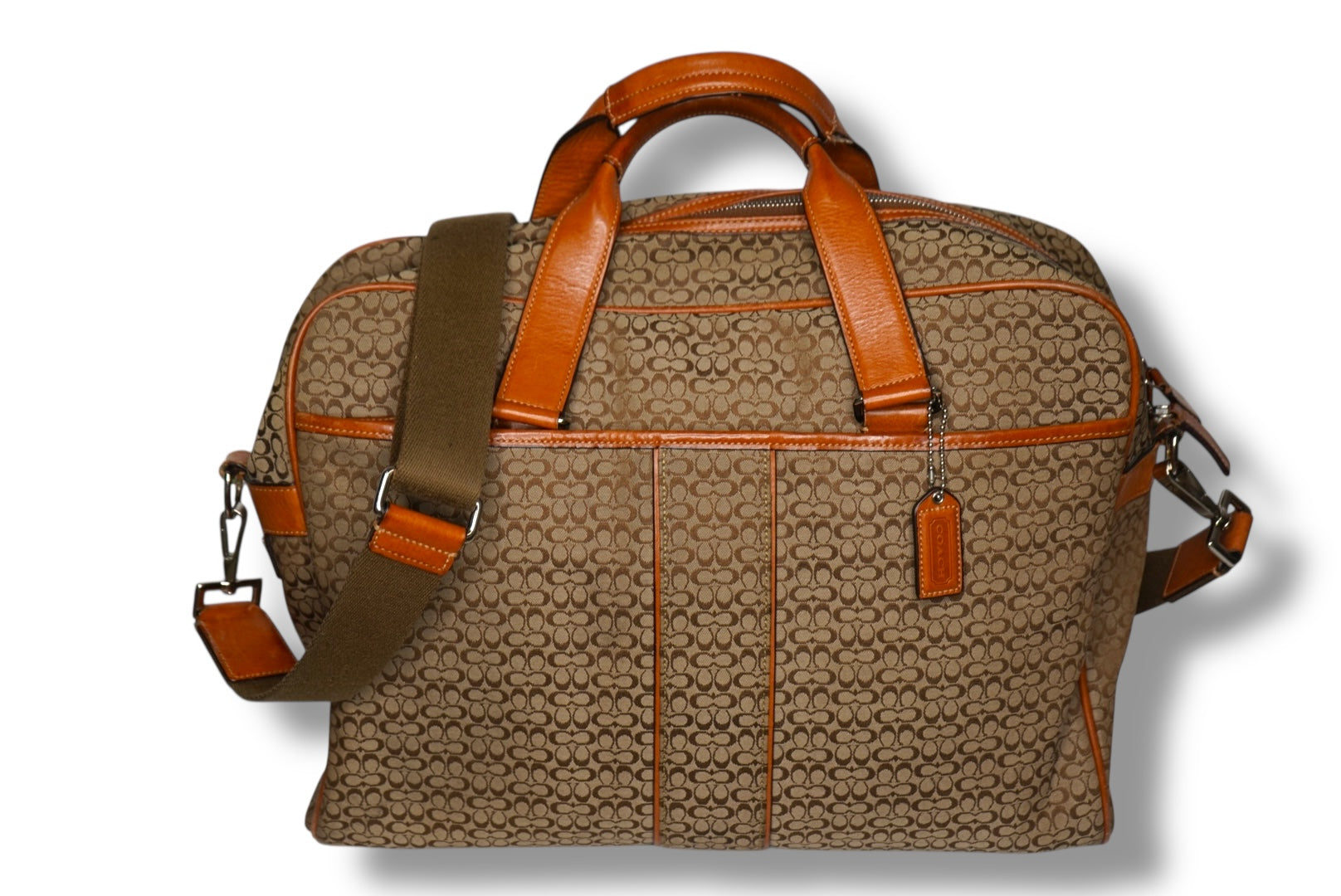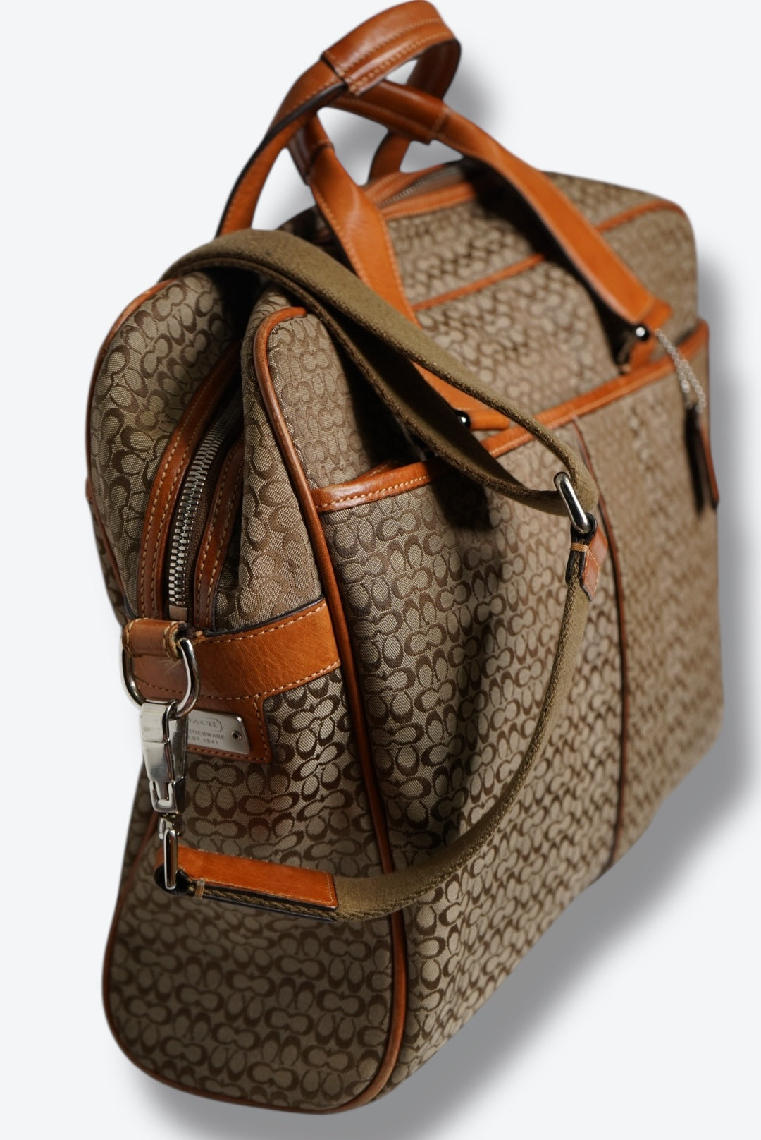 Travel in style with this timeless Coach Signature Messenger Bag. Crafted from Coach’s iconic “C” jacquard canvas and finished with luxurious tan leather trim, this roomy carryall is designed for weekend escapes, quick getaways, or elevated everyday utility. With dual leather top handles, a detachable canvas shoulder strap, and a full-zip closure, it offers both fashion and function in one sleek silhouette.