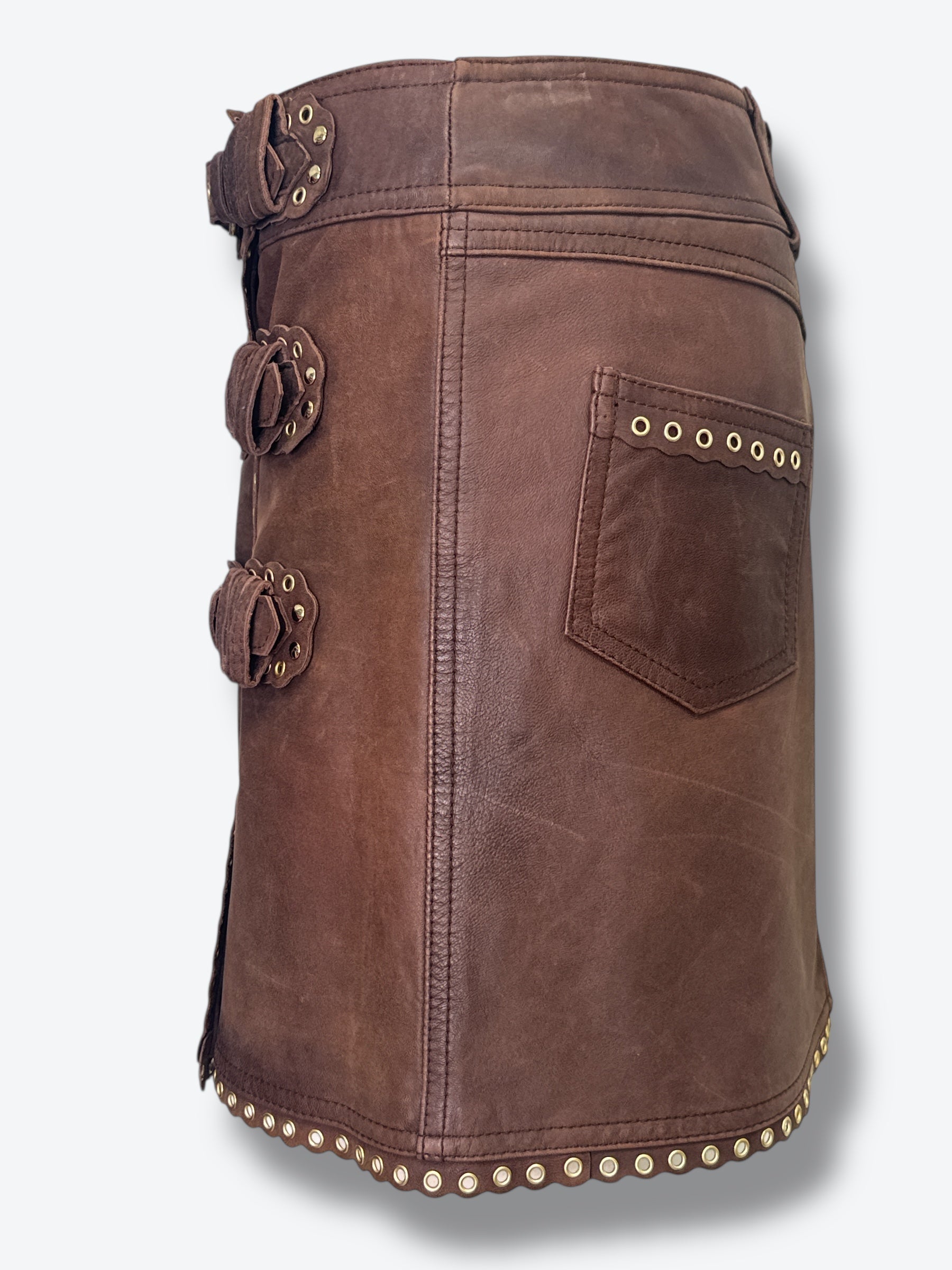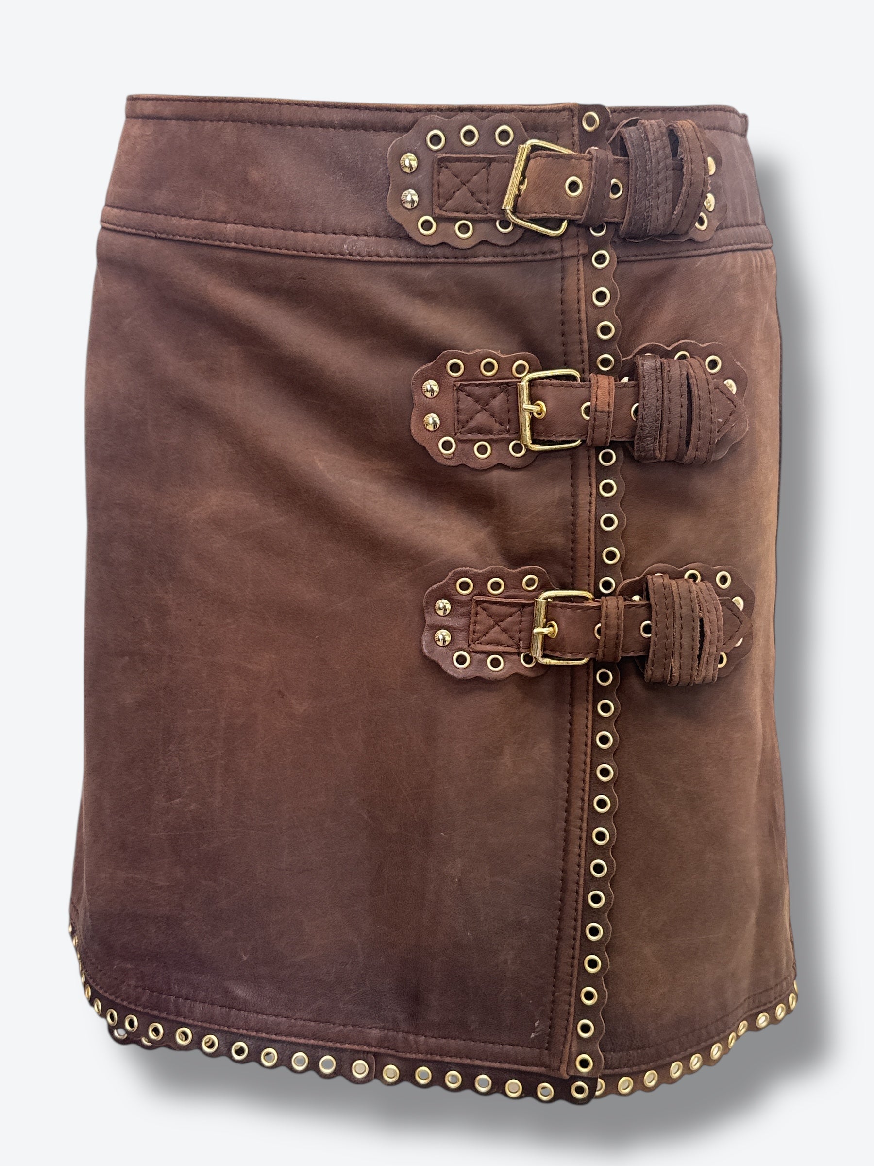 Command attention in this edgy brown leather mini skirt, designed with attitude and detail in every stitch. Featuring a trio of oversized buckle straps and gold-tone grommet trim, this piece fuses biker-inspired grit with high-fashion flair. The asymmetrical front and distressed leather finish add a vintage touch, while the sculpted silhouette hugs in all the right places. Whether paired with combat boots or a structured blazer, this skirt is built to turn heads.
