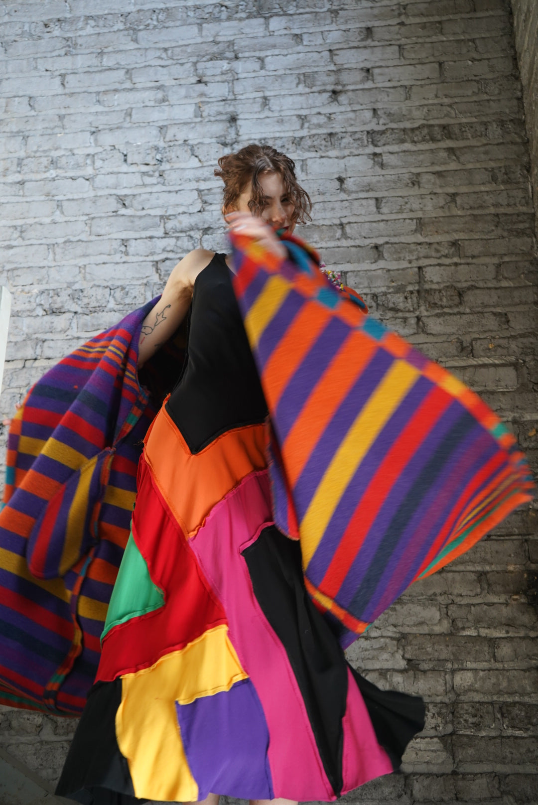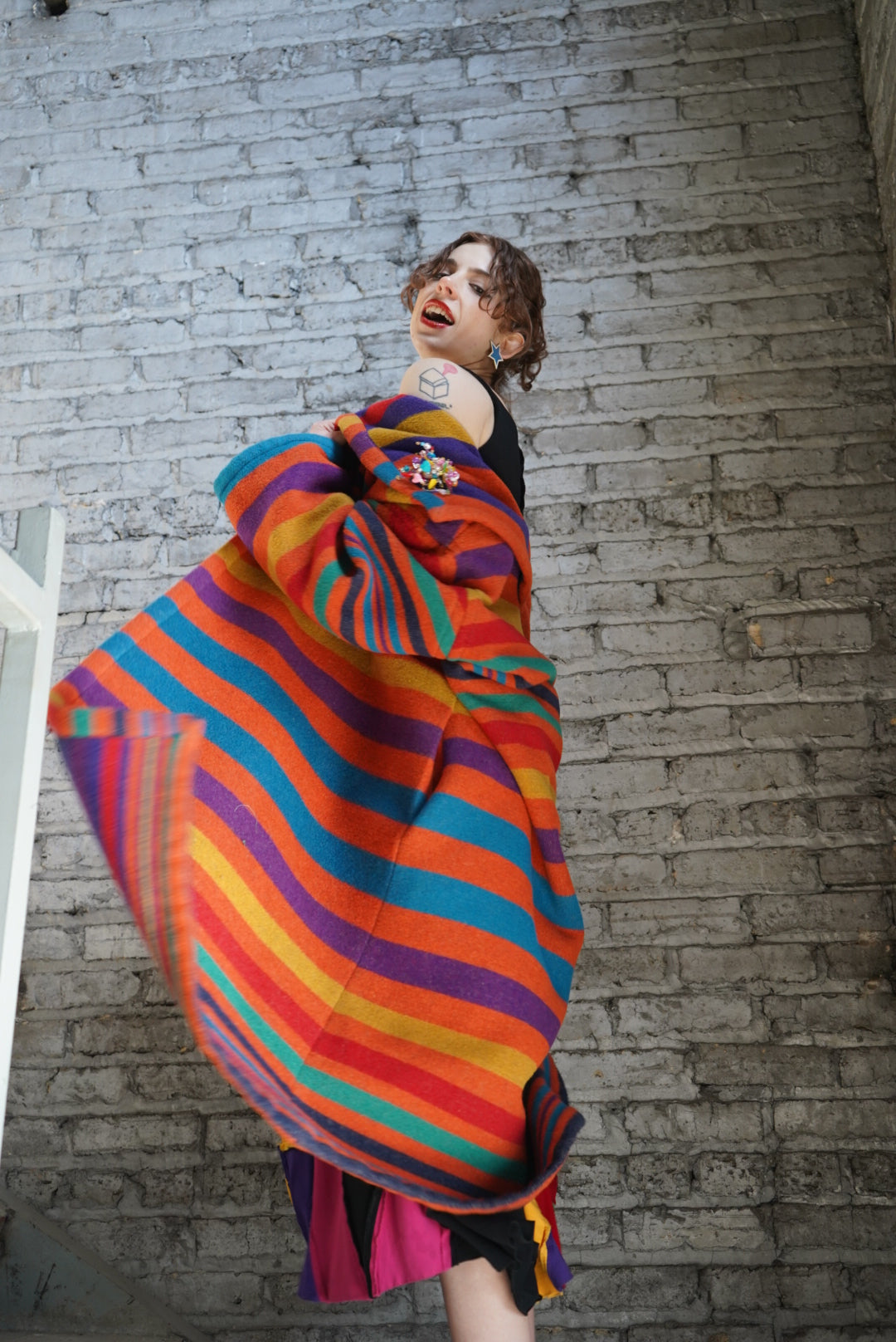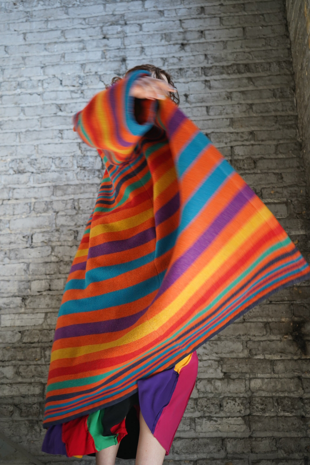 A true wearable work of art, this 1990s sweater jacket by Tony Lambert is a bold celebration of color, texture, and craftsmanship. Designed in rich horizontal rainbow stripes, the piece blends saturated hues with a substantial knit that drapes like outerwear while wearing like a sweater. The longline silhouette and sculptural weight give it dramatic movement, making it equal parts statement and staple.