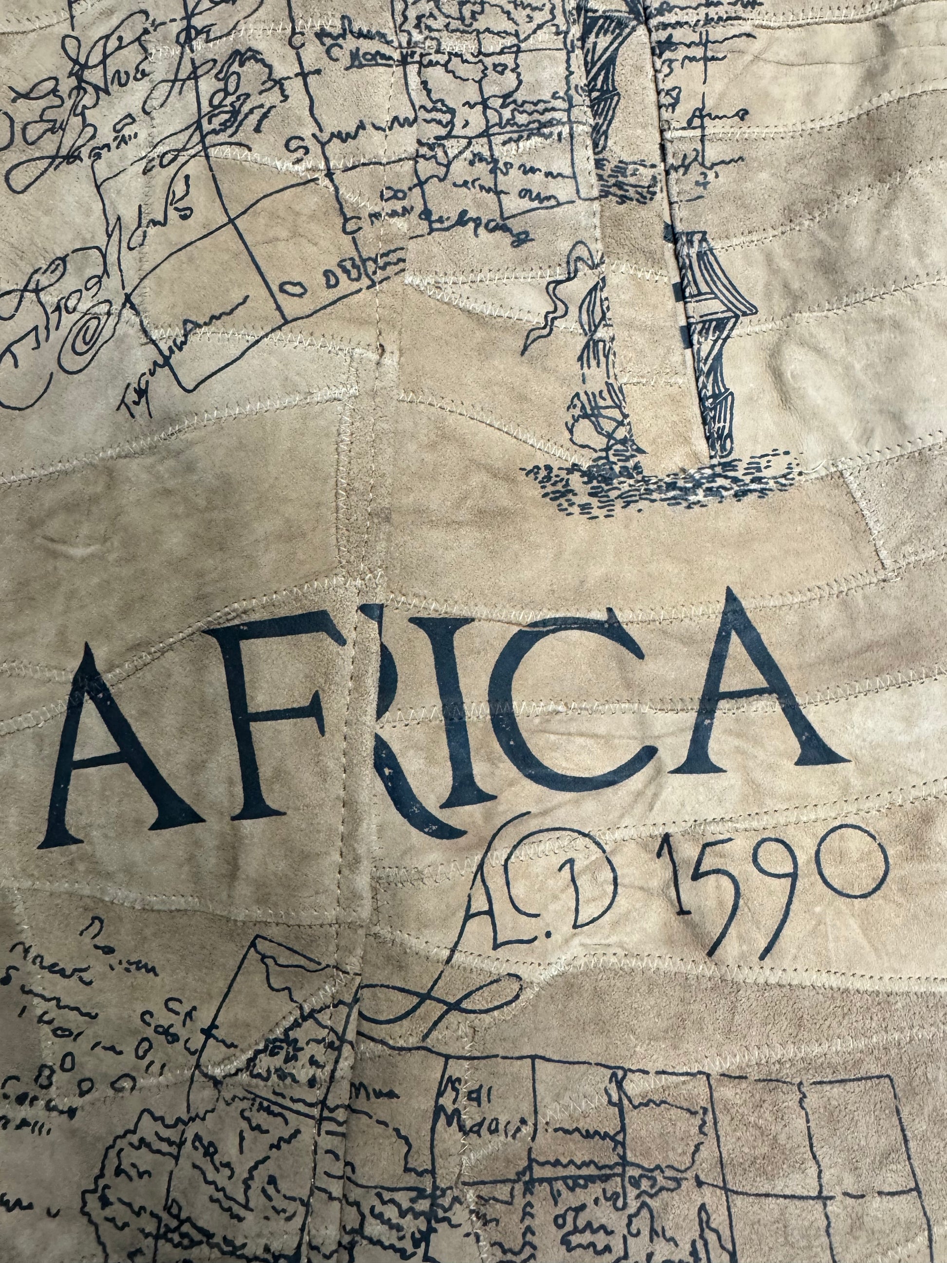 This vintage “Africa” map print coat is a wearable piece of art that celebrates heritage, wanderlust, and individuality. Crafted in a rich camel-toned jacquard fabric, the coat features intricate cartographic and typographic detailing spelling “AFRICA,” creating a textured narrative of culture and exploration. Its oversized silhouette, structured shoulders, and button-front closure offer both comfort and sophistication, making it perfect for layering across seasons. A rare statement piece that fuses storytelling and style — ideal for the modern collector with global sensibility.