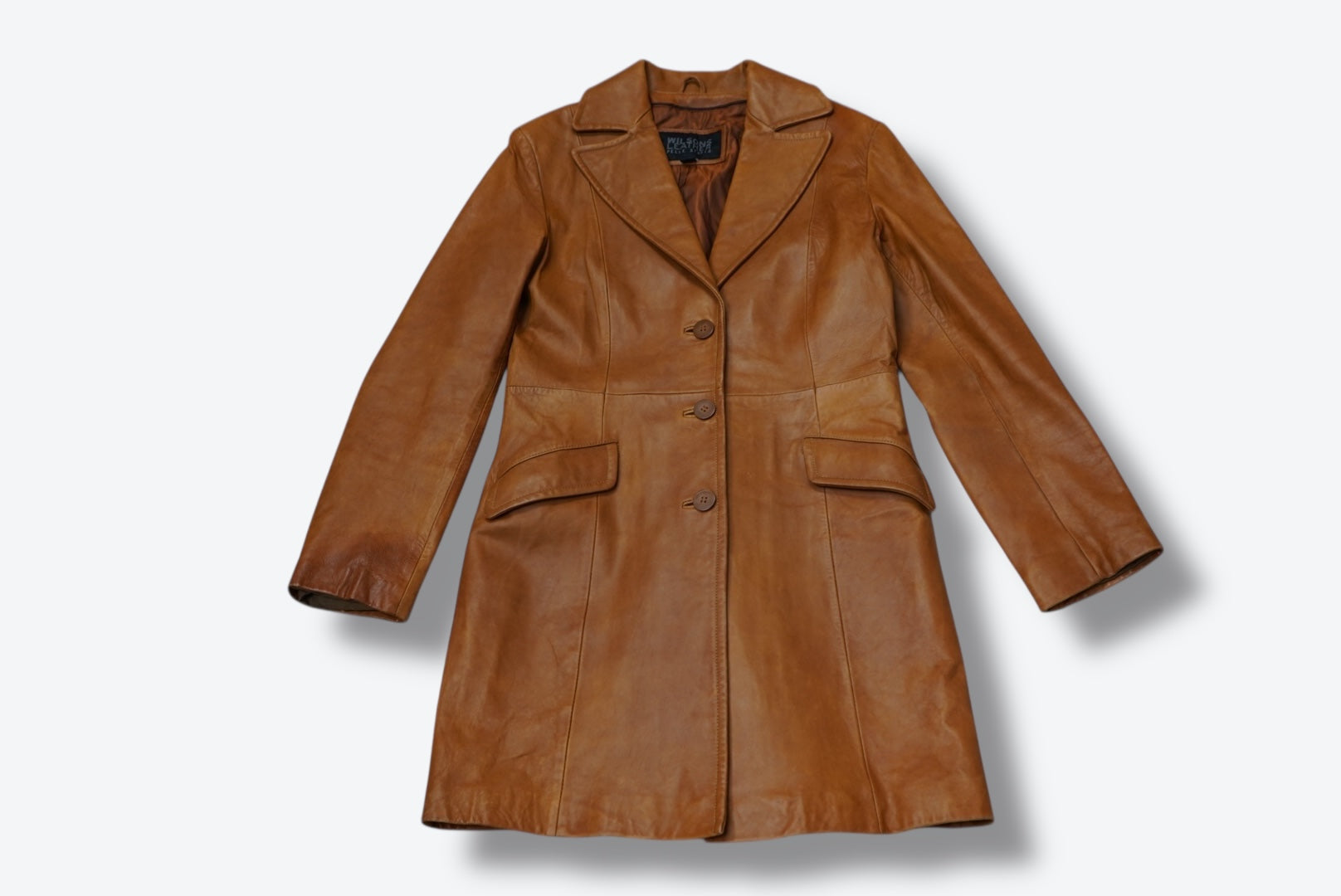A timeless caramel leather coat by Wilsons Leather, crafted in supple, buttery leather with a clean, tailored fit. This polished mid-length silhouette features classic notch lapels, flap pockets, and a streamlined button front—an effortless layer that elevates everything from denim to dresses. The warm cognac hue and minimalist construction make it a forever piece with modern relevance.