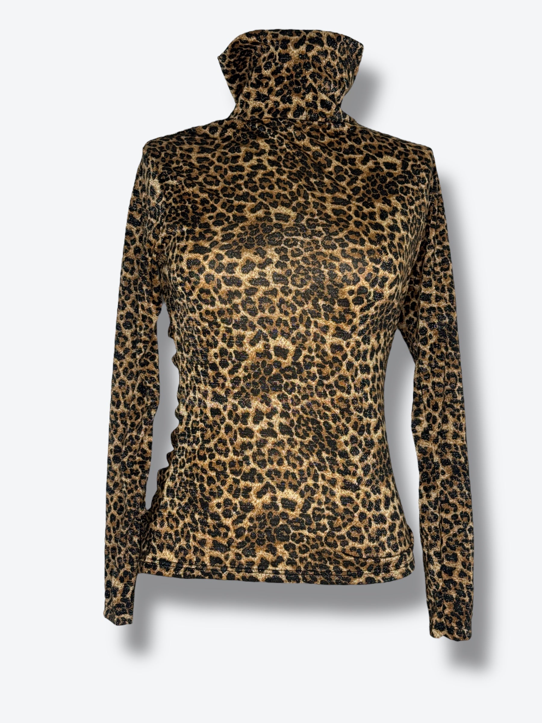 Turn heads with this striking Zeta Otto leopard-print turtleneck top. Crafted in a stretchy metallic knit, the fabric shimmers with subtle silver threads woven throughout, giving classic animal print a bold, glamorous upgrade. The high turtleneck collar and ruched center front create a flattering silhouette, hugging the body while adding dimension. A true statement piece that blends 1990s–early 2000s clubwear energy with timeless feline allure.